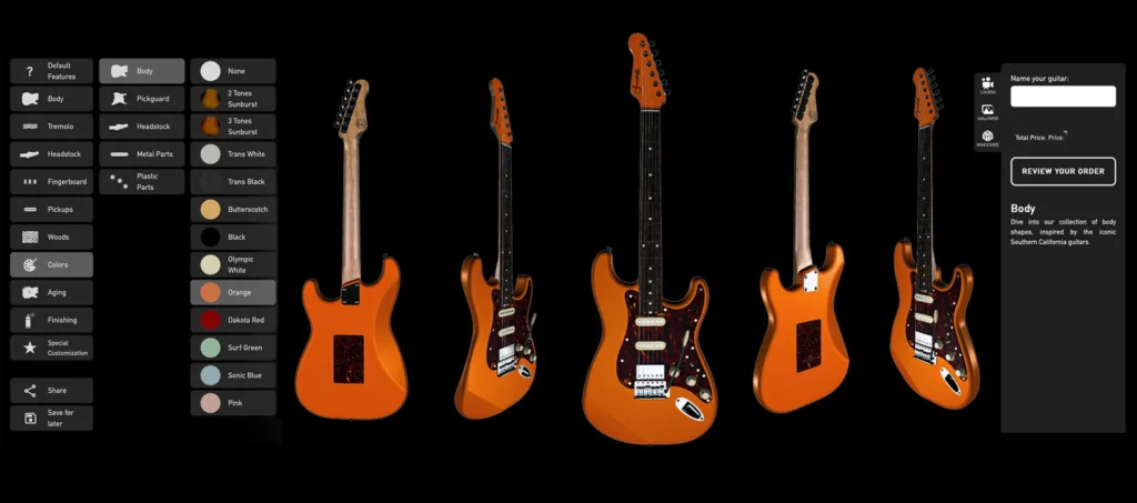 ソンデーリは大量生産を行いません。 公式サイトの 3Dギタービルダー を使ってお客様自身がデザインした内容をもとに、一本ずつ丁寧に製作されます。